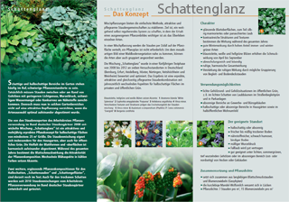 Die von den Staudenexperten des Arbeitskreises Pflanzenverwendung im Bund deutscher Staudengärtner 2008 entwickelte Mischung „Schattenglanz“ ist ein attraktives und mehrjährig erprobtes Pflanzkonzept für halbschattige Flächen von mindestens 25 m2 Größe. Die Staudenmischung eignet sich insbesondere für den Hausgarten, aber auch für öffentliches Grün. Die Vielfalt der Blattformen und -oberflächen ist harmonisch aufeinander abgestimmt. Während des gesamten Jahres bestimmt die Blattschmuckwirkung die Attraktivität der Pflanzenkomposition.Wechselnde Blühaspekte in kühlen Farben setzen Akzente.