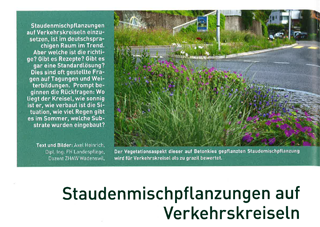 Verkehrskreisel sind voll besonnte Extremstandorte. Die Wärmeeinwirkung hat einen längeren Vegetationszyklus zur Folge. Verkehrskreisel dienen primär zur Verkehrsberuhigung und sollten nicht ablenken. Ihre Begrünung unterstützt diese Primärfunktion. Das heisst auch, dass die Pflegeaufwendungen von kurzer Dauer sein sollten, so dass langwierige Verkehrseinschränkungen vermieden werden können. Hier kommen meist trockenheitsliebende Mischpflanzungen zum Einsatz. Wichtig ist die Beachtung der mittleren Aufwuchshöhe. Sie sollte nicht über 20-30 cm liegen (z.B. "Steppenheide heimisch").
